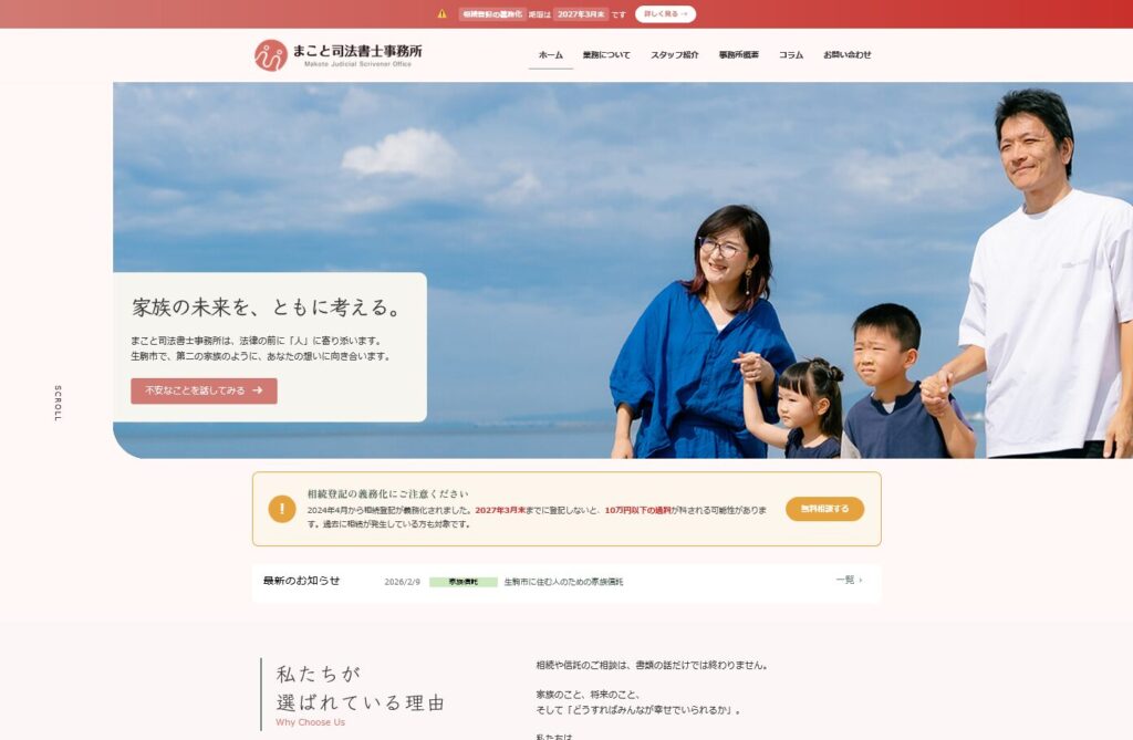 奈良県生駒市を拠点に、家族信託・相続・不動産登記を中心とした司法書士事務所様のWebサイトを制作いたしました。「第二の家族のように寄り添う」という事務所の理念を軸に、温かみのあるデザインと分かりやすい導線設計を実現しました。2024年施行の相続登記義務化に対応した告知バナーや、個人・法人それぞれのサービス紹介ページを体系的に設計。家族信託という専門性の高いサービスを、一般の方にも理解しやすい形で訴求しています。